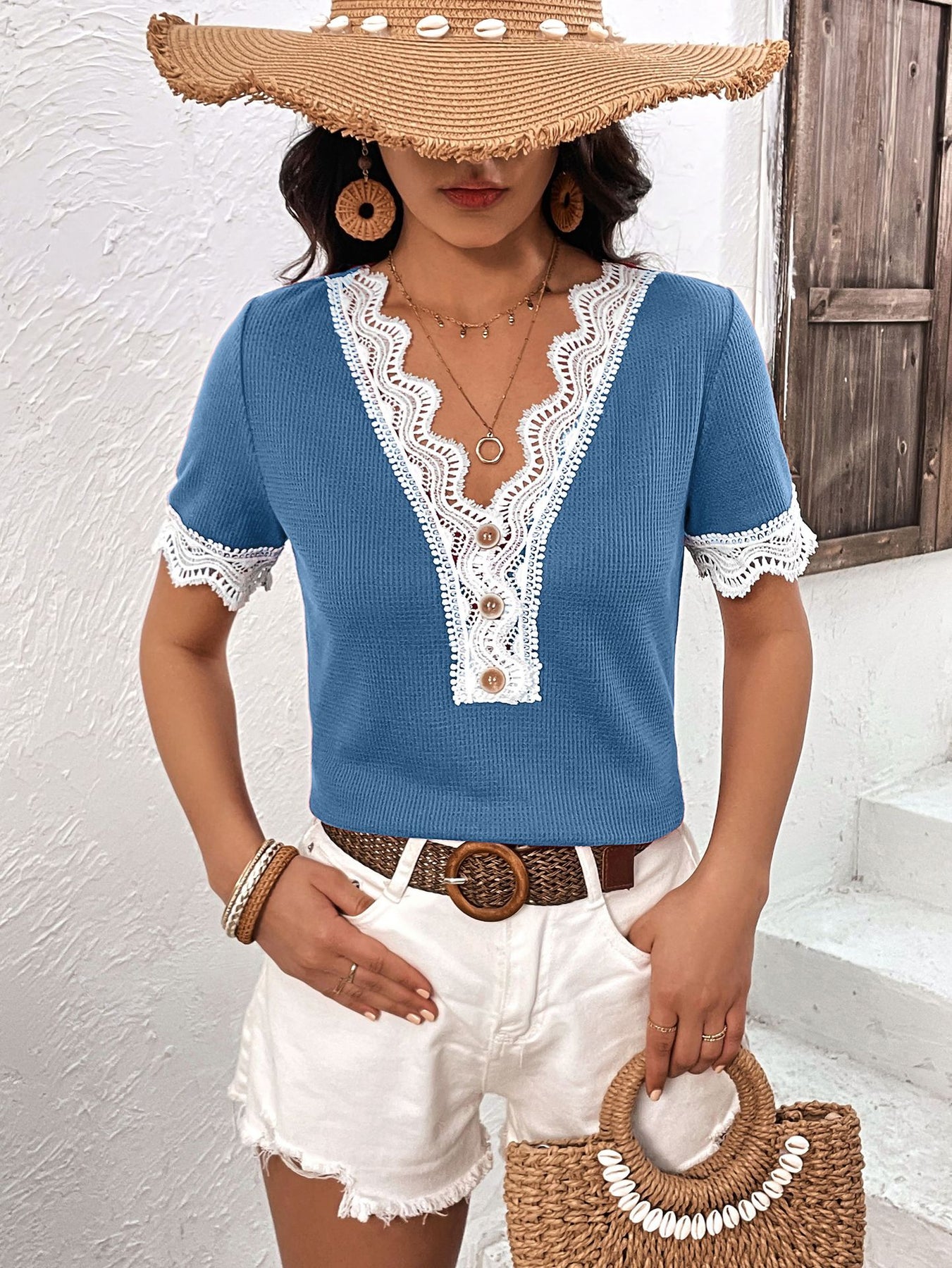 Ivy Lane Decorative Button Spliced Lace Short Sleeve Top